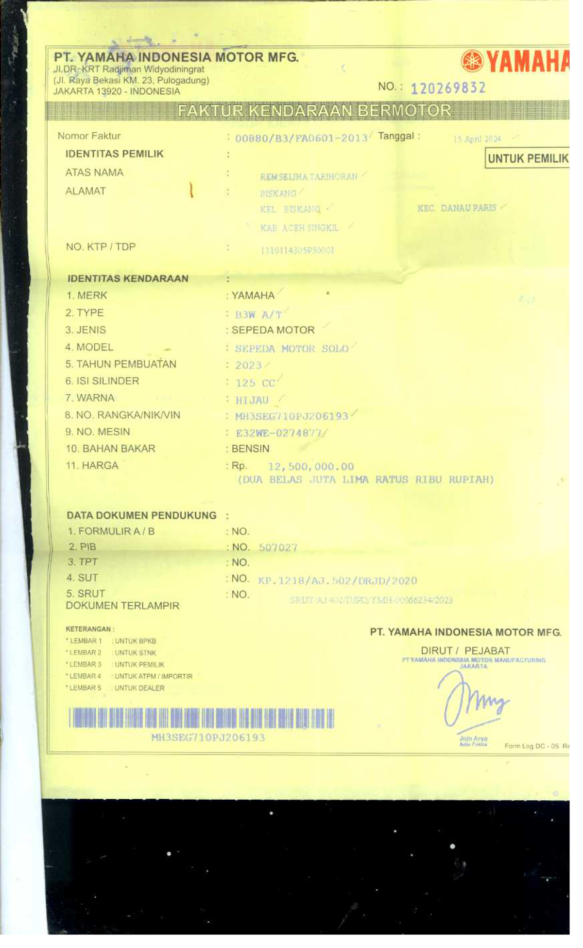 No. Rangka | : | MH3SEG710PJ206193 |